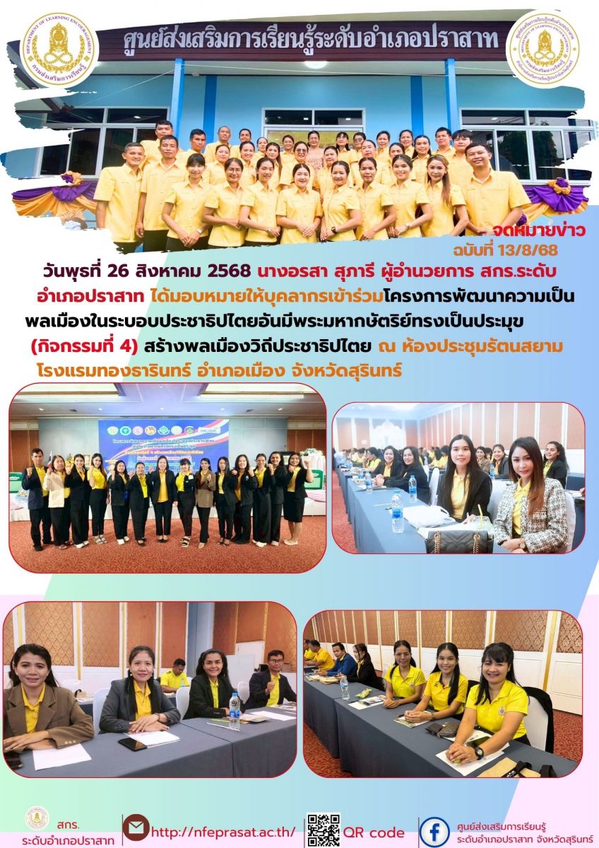 วันพุธที่ 26 สิงหาคม 2568 นางอรสา สุภารี ผู้อำนวยการ สกร.ระดับอำเภอปราสาท ได้มอบหมายให้บุคลากรเข้าร่วมโครงการพัฒนาความเป็นพลเมืองในระบอบประชาธิปไตยอันมีพระมหากษัตริย์ทรงเป็นประมุข(กิจกรรมที่ 4) สร้างพลเมืองวิถีประชาธิปไตย ณ ห้องประชุมรัตนสยาม โรงแรมทองธารินทร์ อำเภอเมือง จังหวัดสุรินทร์