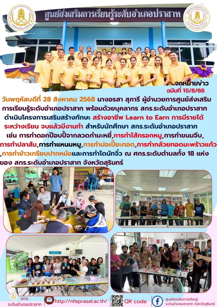 วันพฤหัสบดีที่ 28 สิงหาคม 2568 นางอรสา สุภารี ผู้อำนวยการศูนย์ส่งเสริมการเรียนรู้ระดับอำเภอปราสาท พร้อมด้วยบุคลากร สกร.ระดับอำเภอปราสาทดำเนินโครงการเสริมสร้างทักษะ สร้างอาชีพ Learn to Earn การมีรายได้ระหว่างเรียน จบแล้วมีงานทำ สำหรับนักศึกษา สกร.ระดับอำเภอปราสาท เช่น การทำดอกป๊อบปี้จากลวดกำมะหยี่,การทำไส้กรอกหมู,การทำขนมจีบ, การทำปลาส้ม,การทำแหนมหมู,การทำปอเปี๊ยะทอด,การทำกล้วยทอดมะพร้าวแก้ว,การทำข้าวเกรียบปากหม้อและการทำโดนัทจิ๋ว ณ ศกร.ระดับตำบลทั้ง 18 แห่ง ของ สกร.ระดับอำเภอปราสาท จังหวัดสุรินทร์